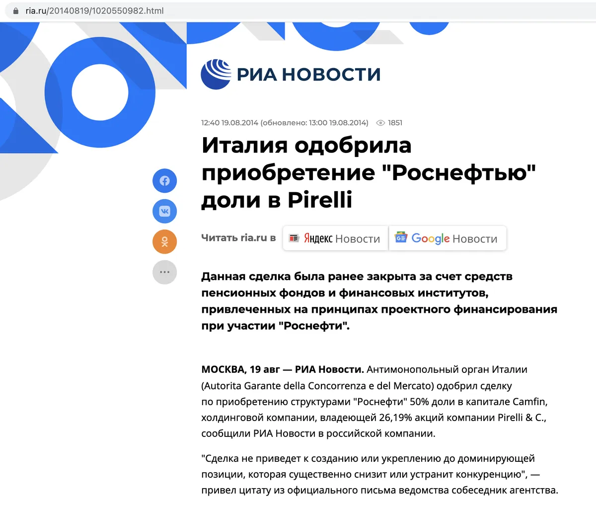 В 2014 году российские государственные информагентства рассказали о торжественном событии: «„Роснефть“ <...> заплатила 12 евро за каждую акцию компании Pirelli, <...> соглашение о заключении этой сделки было подписано в рамках ПМЭФ-2014 (Петербургского международного экономического форума. — Прим. ред.) в присутствии президента Владимира Путина», – сообщил ТАСС. «Италия одобрила приобретение „Роснефтью“ доли в Pirelli», – утверждало РИА «Новости».