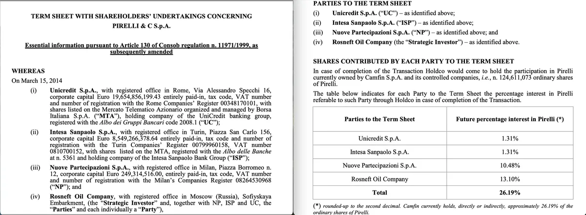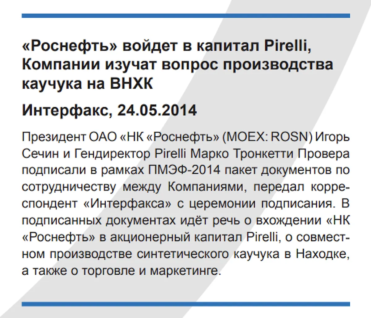«НК „Роснефть“ достигла договоренности с международным консорциумом в составе банка Unicredit, банка „Интеза“ , фонда „Клессидра“ о покупке доли 50 % компании-держателя 26,19 % акций „Пирелли“ », – отчиталась «Роснефть» в марте 2014 года.