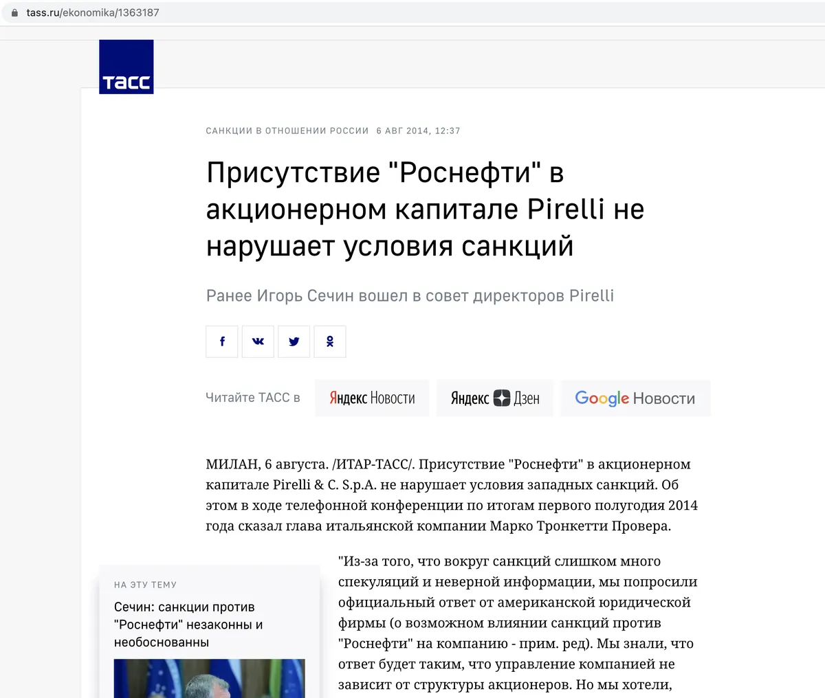 Позже ТАСС даже опубликовало позицию руководства итальянской компании по поводу сделки: «Присутствие „Роснефти“ в акционерном капитале Pirelli не нарушает условия западных санкций. Об этом в ходе телефонной конференции по итогам первого полугодия 2014 года сказал глава итальянской компании Марко Тронкетти Провера».