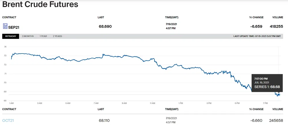 Цена нефти марки Brent 19 июля впервые с 1 июня опустилась ниже 70 долларов за баррель. Это следует из данных торгов на бирже ICE.