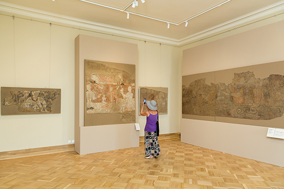 Как сообщает пресс-служба Эрмитажа, в девяти залах третьего этажа Зимнего дворца (залы 342–334) посетители музея могут познакомиться с уникальными памятниками культуры Востока — с культурой Согдианы и Пенджикентскими росписями, культурой Хорезма, древним городом Хара-Хото и пещерным монастырем Безеклик, произведениями тибетской живописи.