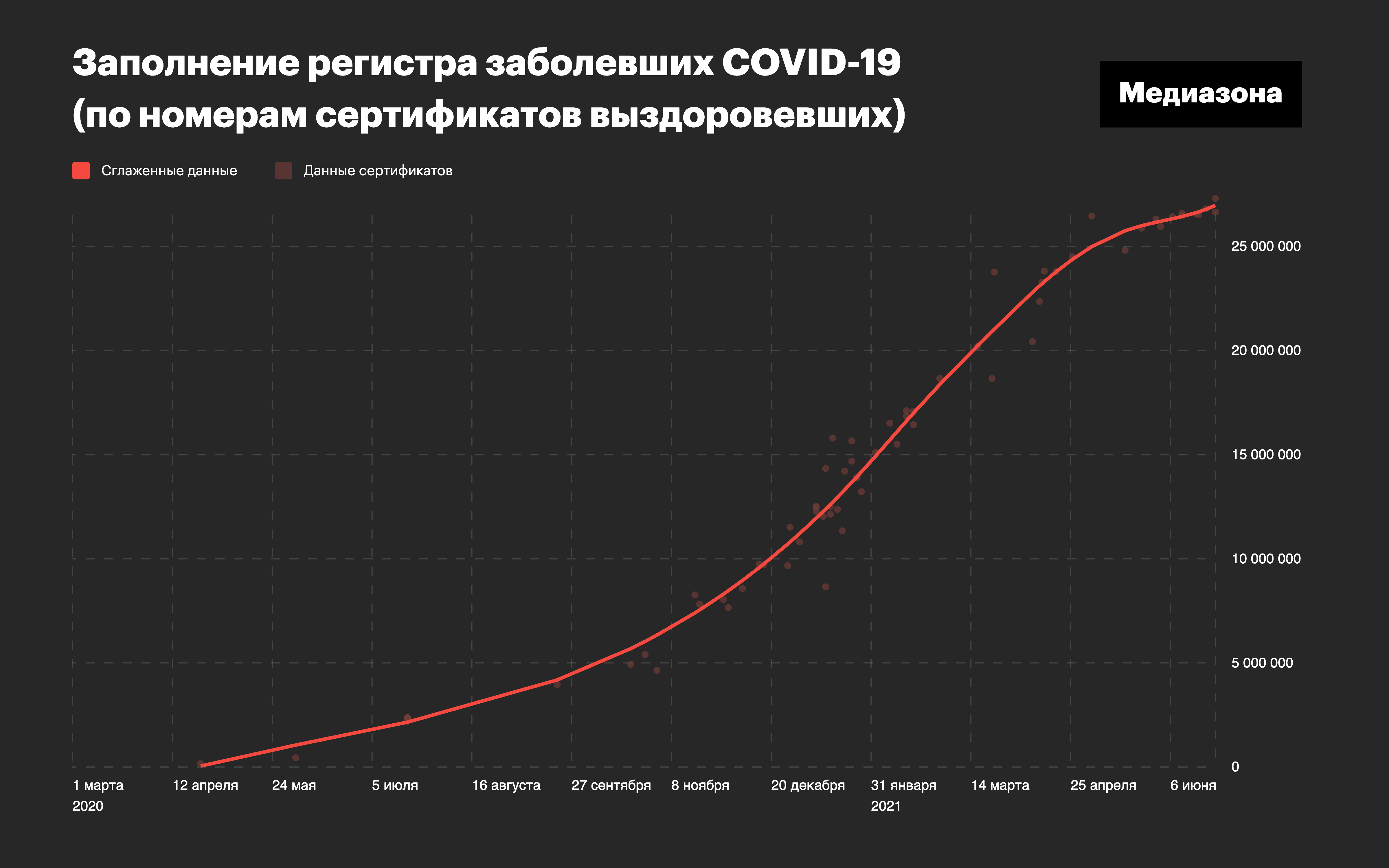 Самый свежий из полученных им сертификатов принадлежит человеку, переболевшему коронавирусом в июне 2021 года. Его порядковый номер — 27 миллионов 300 тысяч. На вопрос о том, соответствует ли эта цифра за июнь действительности, знакомый с работой реестра источник «Медузы» в одном из федеральных ведомств ответил: «Так и есть».