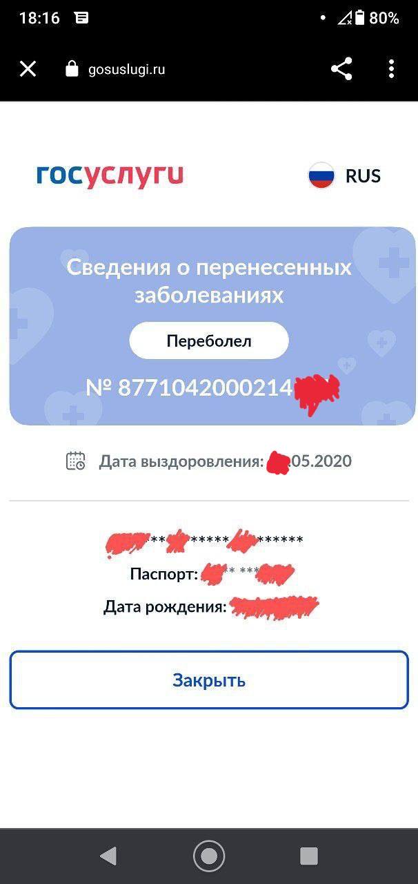 После публикации текста с «Медиазоной» связался , который сообщил, что в июле 2021 года из-за ошибки на сайте Госуслуг получил сертификат переболевшего COVID-19 — хотя перенес он коронавирус еще в апреле 2020 года и выздоровел в мае.