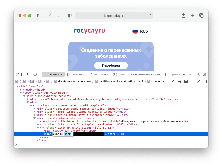 The QR code is really just an ordinary hyperlink that leads to a special section of the Gosuslugi website. Restaurant employees in Moscow were supposed to open this link to make sure that a particular customer is cleared for indoor dining. But if you open the link on a computer and look at the page’s code, you’ll see that the certificate number is designated by the abbreviation “UNRZ.” This stands for “unique registry record number” (unikalny nomer registrovoy zapisi, in Russian) — a term that’s used in many of the Russian Health Ministry’s registries and also appears in the code of the vaccination certificates (pictured below).