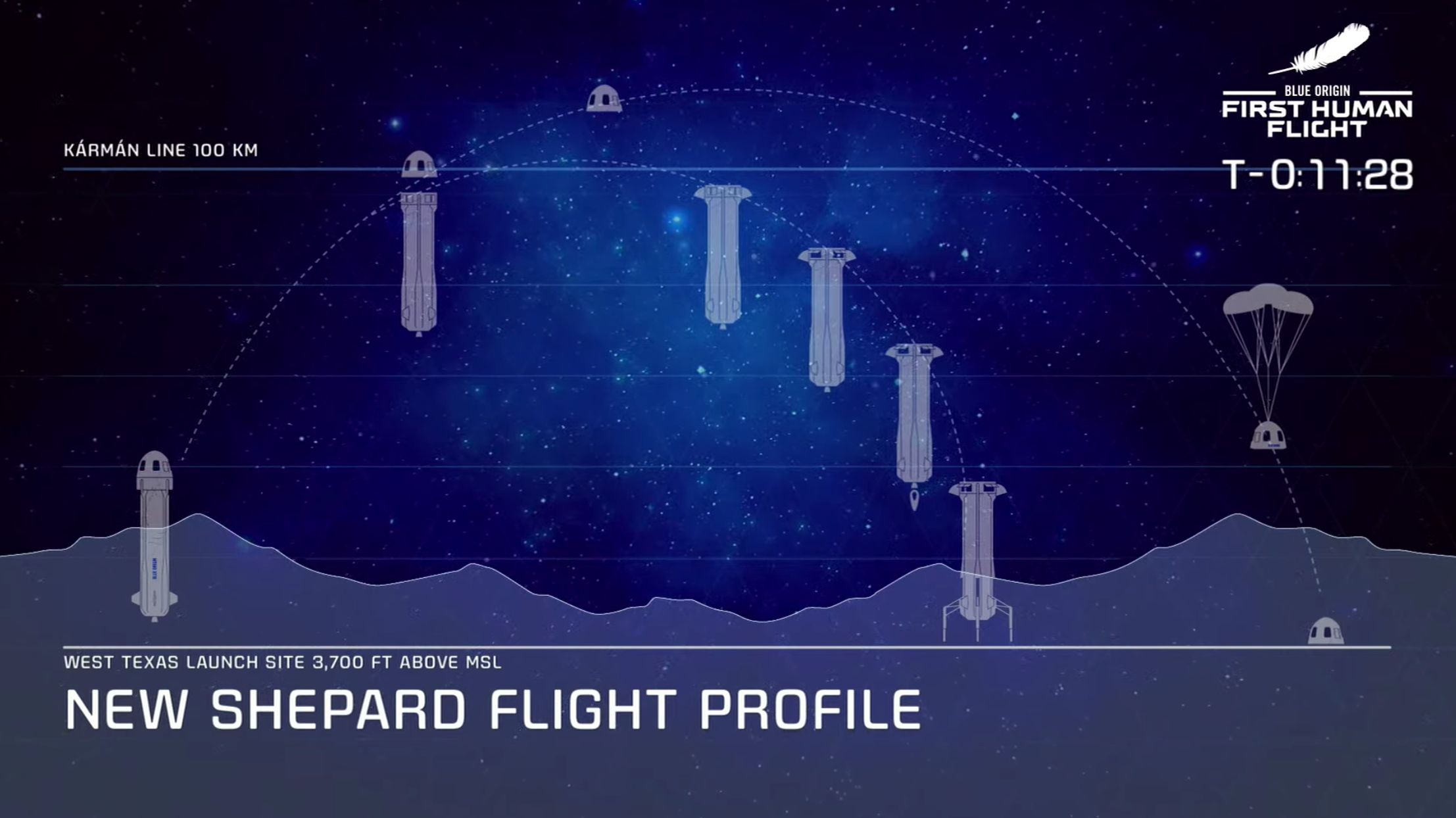 План такой: ракета New Shepard взлетит с космодрома, после чего капсула с экипажем отделится, а разгонная ступень совершит вертикальную посадку.
