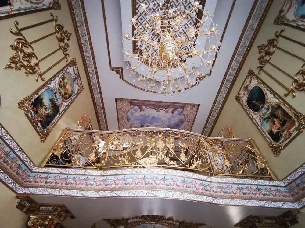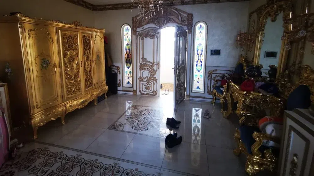 Внутри дома — как минимум две мраморные лестницы с коваными золотыми перилами и несколько просторных комнат: гостиная, кухня, спальня, баня и тренажерный зал. Стены большинства помещений украшены лепниной с золотыми вставками, картинами и массивными светильниками с хрустальными элементами. На потолке — роскошные люстры и фрески, мраморный пол в некоторых комнатах покрыт коврами, в ванной — золотой унитаз. Интерьер больше похож на музей, чем на жилое помещение.