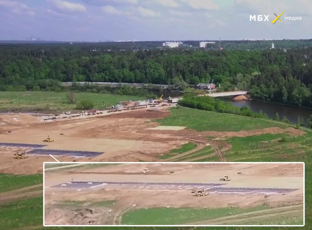 Помимо этого, журналисты рассказали о строительстве моста через реку от резиденции, который ведет к полю. По данным «МБХ», участок этого поля был отмежеван по заказу ФСО. Сейчас территорию на краю поля огородили забором, а берег реки укрепили. Журналисты предположили, что там тоже может начаться стройка: судя по размеченным прямоугольникам, это будущая вертолетная площадка.