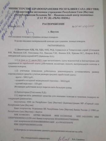 Исполняющая обязанности гендиректора Республиканской больницы № 1 в Якутии Валентина Саввина распорядилась вычесть в качестве «добровольной помощи» из зарплат работников больницы средства на тушение пожаров в регионе. Приказ «об оказании помощи в тушении лесных пожаров», подписанный Саввиной, опубликовал в фейсбуке политолог Илья Паймушкин.