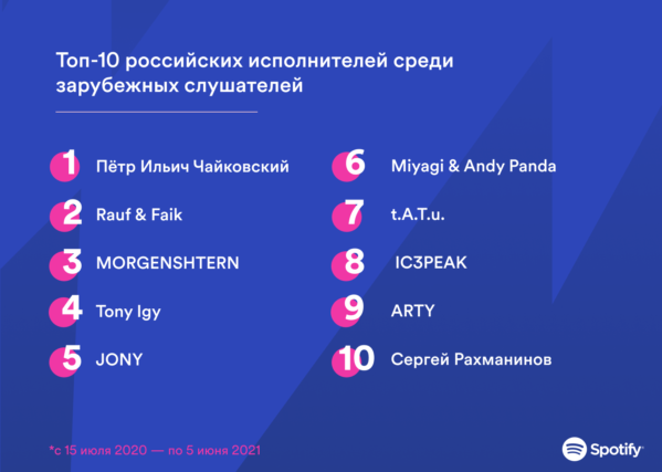Первую строчку в списке занял классик Петр Чайковский, на втором месте — дуэт из Ижевска Rauf & Faik, на третьем — Моргенштерн. На седьмой строчке рейтинга оказалась группа «Тату», отмечающая в этом году 20-летие дебютного альбома «200 по встречной». Замыкает десятку русский композитор Сергей Рахманинов.