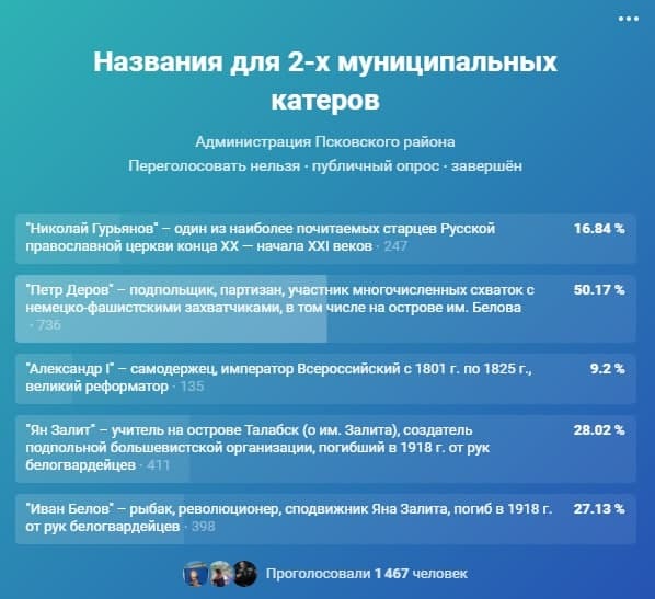 Отметим, ранее администрация Псковского района объявила открытое интернет-голосование по определению названий для двух муниципальных катеров. Конкурсная комиссия отобрала пять лучших названий: «Николай Гурьянов», «Петр Деров», «Александр I», «Ян Залит», «Иван Белов». В интернет-голосовании выиграл вариант «Петр Деров», однако члены комиссии заявили о накрутке со стороны спам-бота из-за рубежа и сняли с конкурса этот вариант.