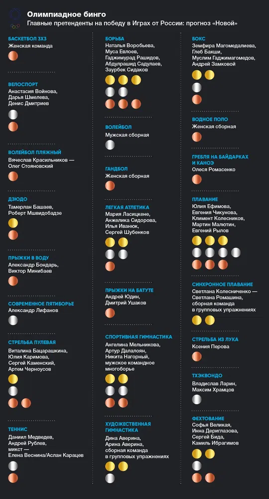 Явными фаворитами, которые должны завоевать в Токио ордена высшей пробы, по мнению «Новой», являются: гимнастка из США Симона Байлз, пловчиха из Венгрии Катинка Хоссу, дзюдоист из Франции Тэдди Ринер, грузинский штангист Лаша Талакадзе, шведский шестовик Арман Дюплантис, японский каратист Ре Киюна. Сборная США по баскетболу, сборная Китая по настольному теннису, прыгуны в воду из Поднебесной.