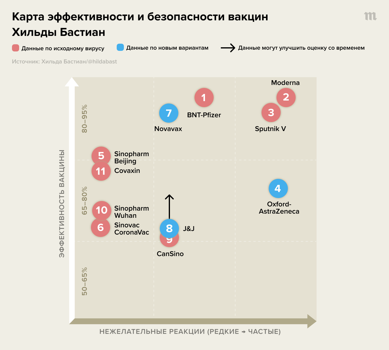 Очень грубо вакцины можно разделить на более или менее реактогенные. К первым относятся применяемые сейчас мРНК-вакцины, ко вторым — фактически все остальные. Немного более подробную, хотя и тоже очень грубую классификацию предлагает научный журналист Хильда Бастиан. Согласно ее экспертному мнению, вакцины на карте «эффективность — реактогенность» располагаются примерно в таком порядке: