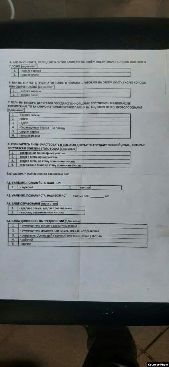 Сотрудник "Газпрома" из Ленского района Архангельской области также на условиях анонимности сообщил, что анкетирование проходило и у них: "Такая бумага была, в пятницу принесли, вчера уже забрали. Добровольно кто хотел, заполнял, многие вообще ее не видели", — уточнил он.