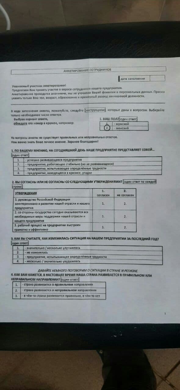 Всего в анкете 8 пунктов. Респондентов просят оценить по четырех балльной шкале работу предприятия, указать, насколько оно важно для государства, и как меняется ситуация в компании. С четвертого пункта вопросы касаются работы государственных структур и политики. Людей просят ответить, в каком направлении развивается Россия, дать оценку работе федеральных и региональных властей и выбрать партию, за которую они будут голосовать на предстоящих выборах. В пятом вопросе респондентов спрашивают о том, как работает президент Владимир Путин и предлагают выбрать из двух вариантов: «скорее хорошо» и «скорее плохо». В конце анкеты респондента просят указать его пол, возраст, образование и должность на предприятии.