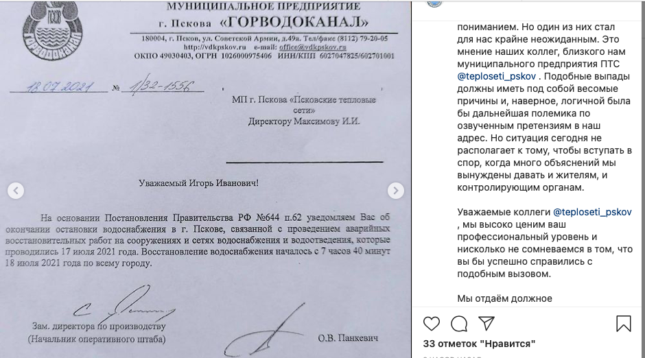 МП города Пскова «Горводоканал» на своей странице в Instagram ответило на критику со стороны «Псковских тепловых сетей» по поводу событий 17-18 июля, когда двое суток Псков был отключён от водоснабжения: водоканал назвал этот отзыв со стороны «близкого муниципального предприятия» неожиданным.