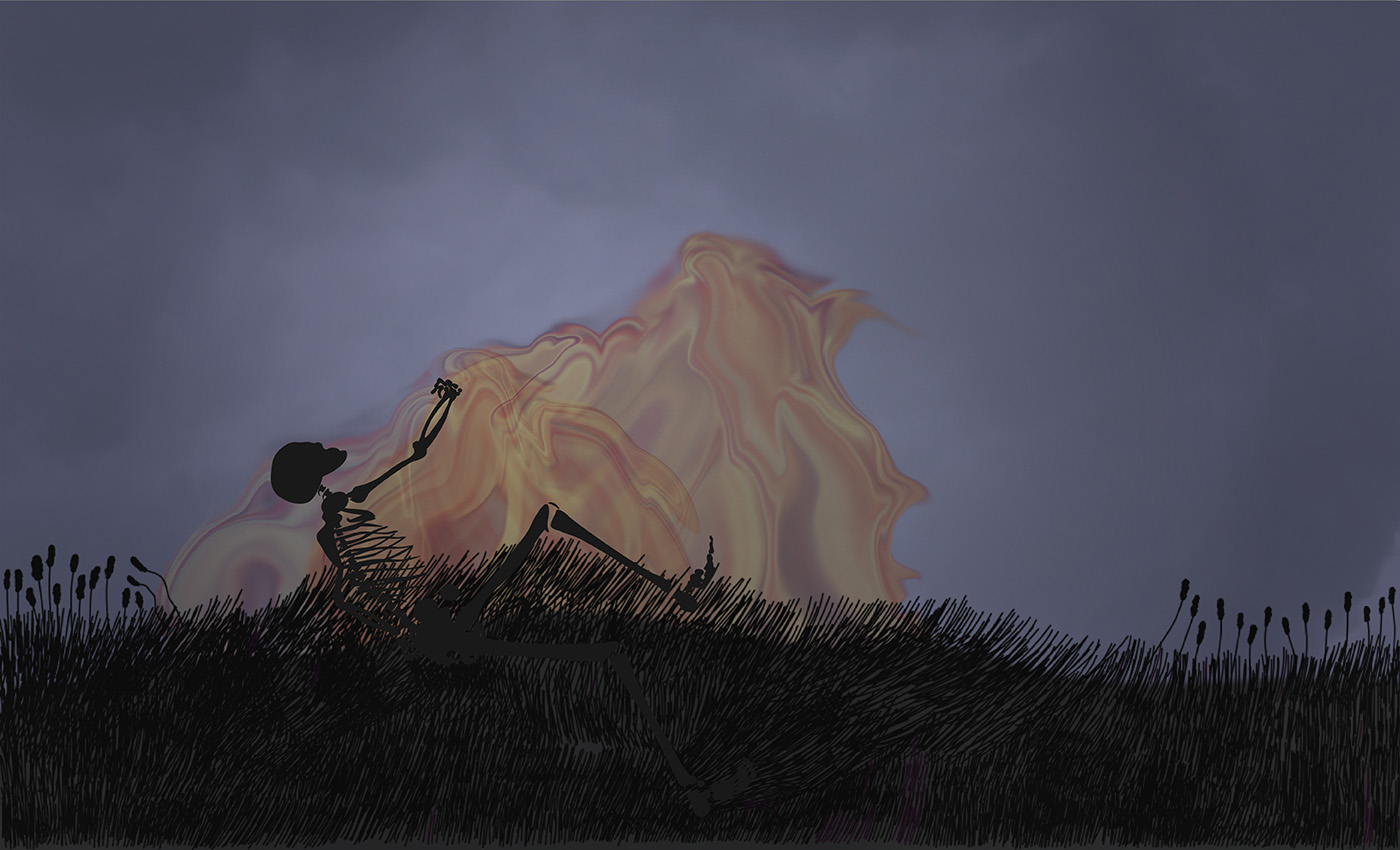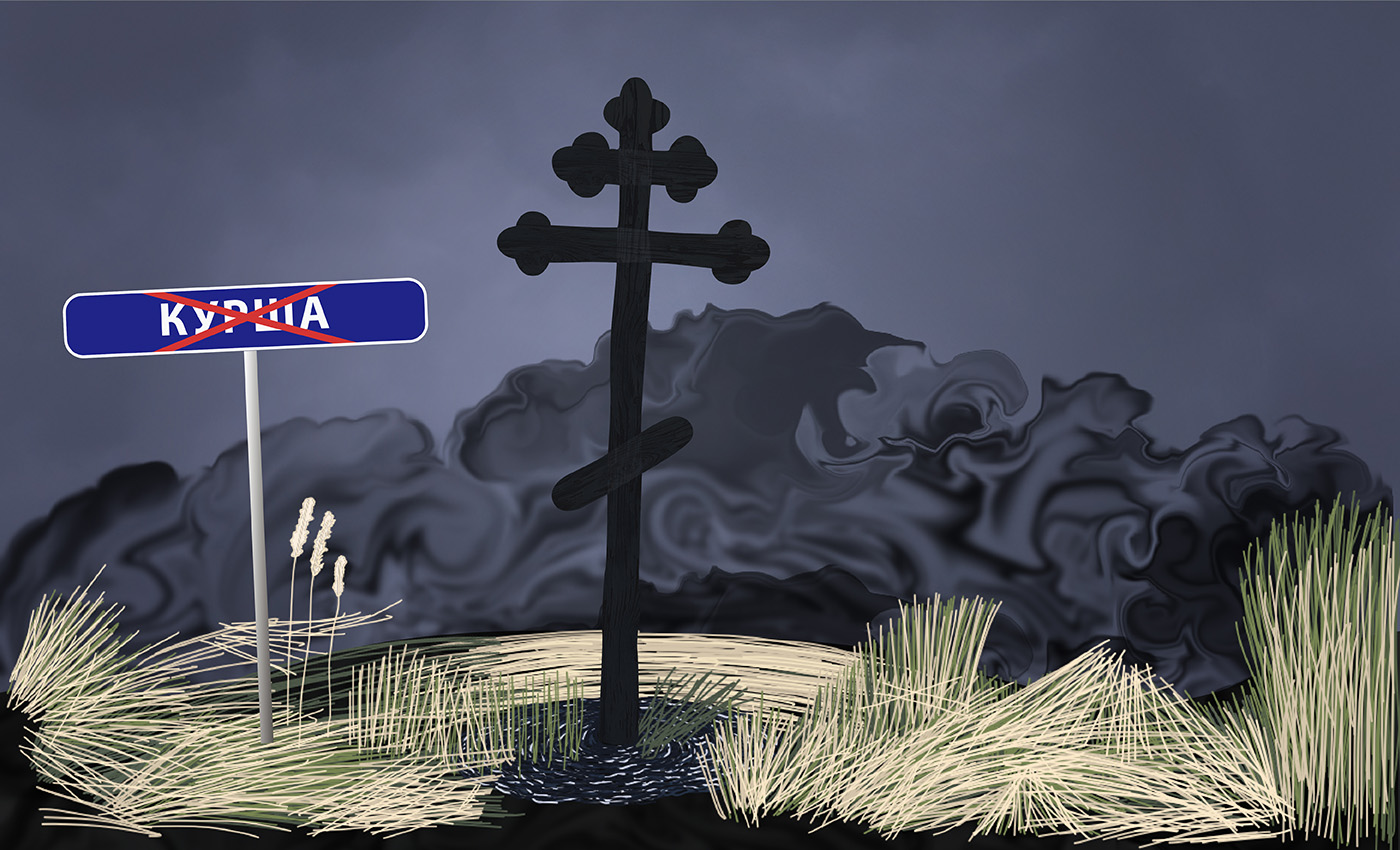 Первое, что встречает нас у погоста — остов старого памятника погибшим, разрушенная железобетонная пирамидка. Еще есть дорожный знак с перечеркнутым названием «Курша», его заказали рязанские активисты и внуки тех, кто помнил пожар 1936-го. Рядом — безымянная могила с яркими искуственными цветами: одна из последних жительниц Курши завещала похоронить ее на родине.