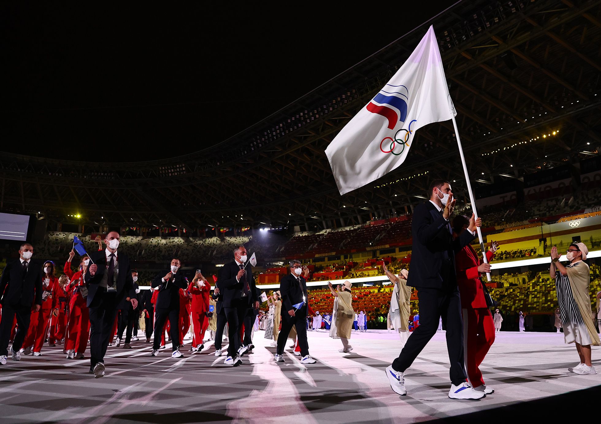 Kai Pfaffenbach / Reuters / Scanpix / LETA Максим Михайлов с флагом ОКР (белое полотнище с пятью олимпийскими кольцами и тремя языками пламени в цветах флага РФ), под которым выступают атлеты из России
