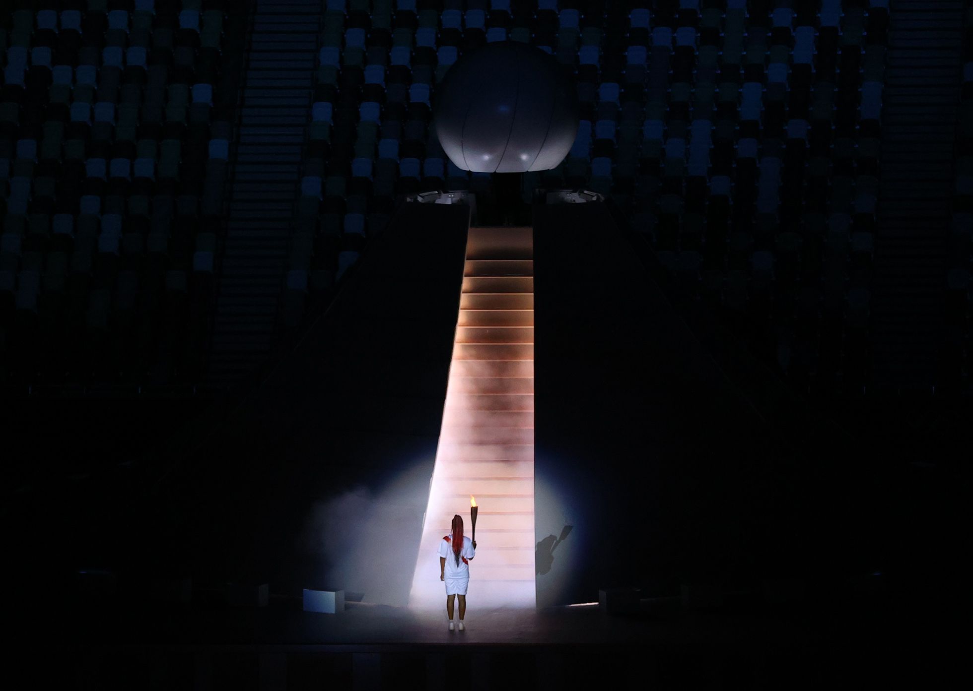 Marko Djurica / Reuters / Scanpix / LETA Теннисистка Наоми Осака готовится зажечь олимпийский огонь