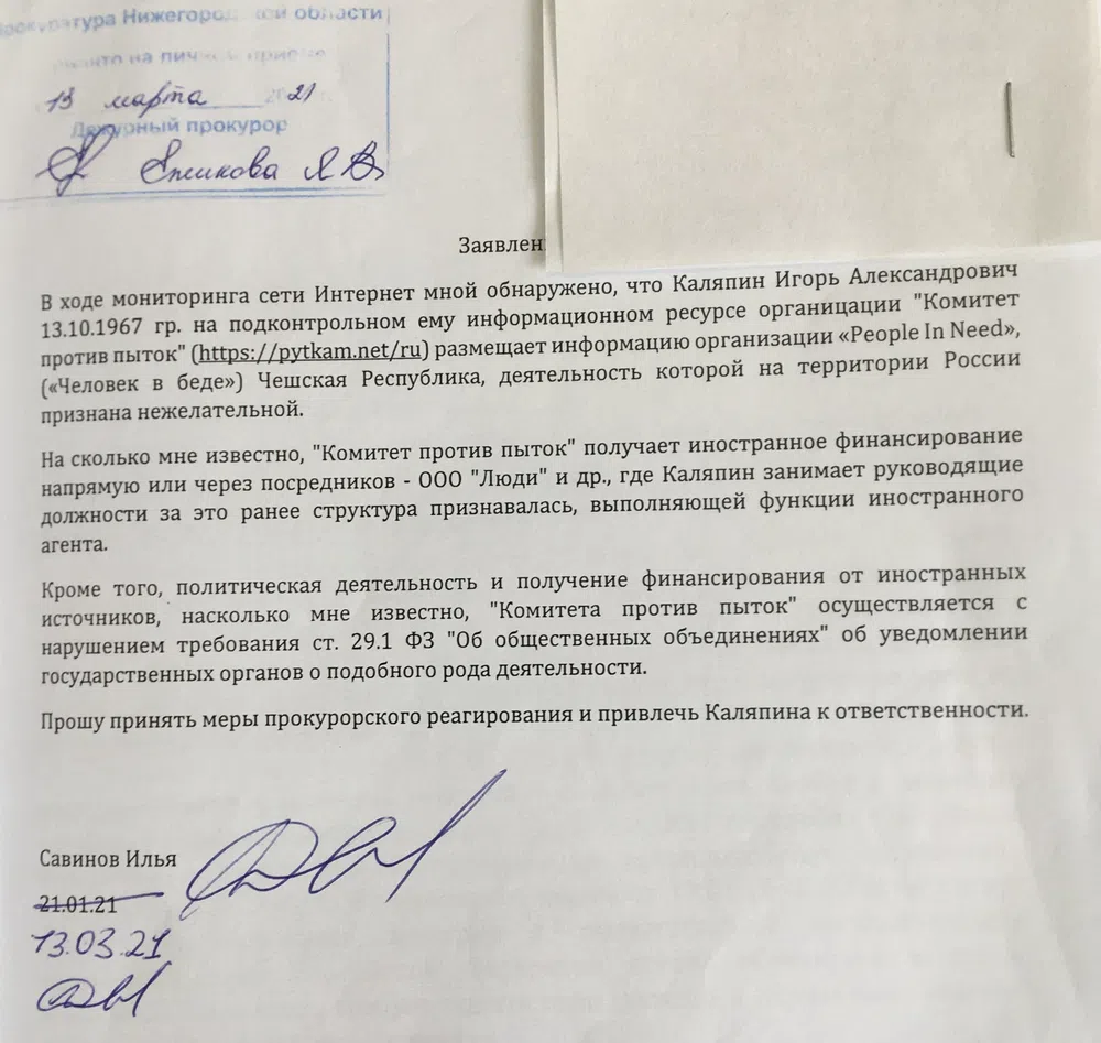 Протокол составили после жалобы гражданина Ильи Савинова. Савинов — бывший член созданного по инициативе Владимира Путина Общероссийского народного фронта (ОНФ), а также известный в Нижнем Новгороде «борец с оппозицией». В жалобе Савинов утверждает, что «Комитет против пыток» якобы получает иностранное финансирование. При этом дата написания жалобы исправлена от руки — с 21 января на 13 марта.