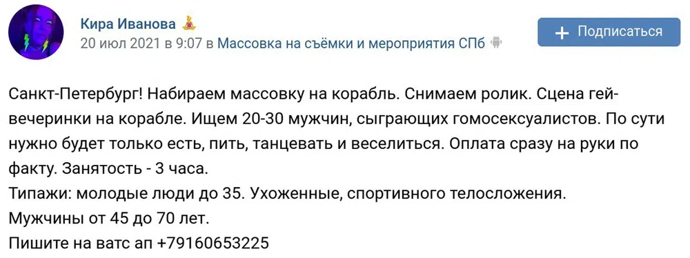 На дистанционный кастинг заявились двое журналистов «Новой газеты». И были приняты. Нам сразу скинули подробности предстоящей съемки (орфография сохранена): «Распространяться ролик будет в телеграм-каналах. Снимаем вечеринку депутатов-геев. Ваши имена называться, естественно, не будут. Текста ни у кого нет. Это массовая сцена, в которой геи просто веселяться)) Крупных планов будет по минимуму. Целоваться ни с кем не надо (на всякий случай. А то мне этот вопрос задали) По одежде четкой задачи я пока не получила. Но на всех будут наши футболки с ЛГБТ-символикой. В целом задача простая: танцевать, есть и пить. Плаваем два часа по каналам и по Неве. Возвращаемся на Фонтанку, 64. Расчет по прибытию».