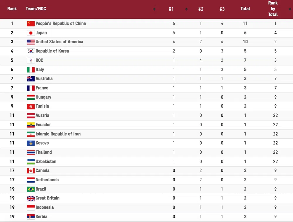 В медальном зачете на сегодняшний день лидирует сборная Китая, у нее шесть золотых, одна серебряная и четыре бронзовых медалей. В первой пятерке также находятся команды Японии (5+1+0), США (4+2+4) и Южной Кореи (2+0+3).