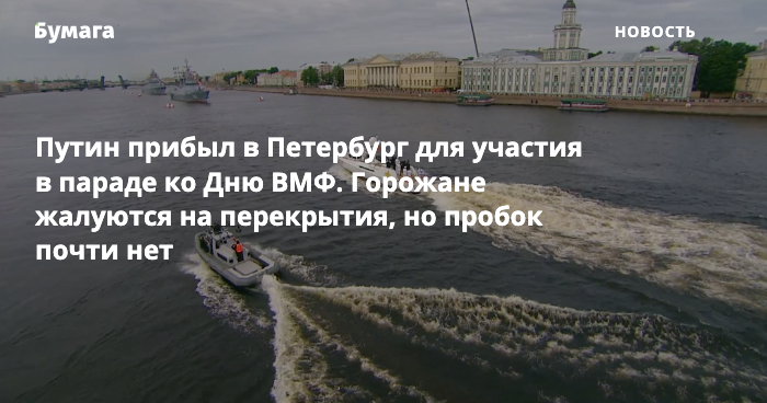 Главный военно-морской парад начнется в 11 утра. В нем примут участие 54 корабля. Из-за парада до 14:00 будут закрыты участки дорог от Дворцового моста до Невского проспекта и Гороховой улицы, Университетская набережная и Биржевая площадь на Васильевском острове. Кроме того, недоступны Троицкий, Благовещенский и Литейный мосты, части Малой и Большой Морских улиц, часть Литейного проспекта, съезды с Воскресенской и Пироговской набережных.