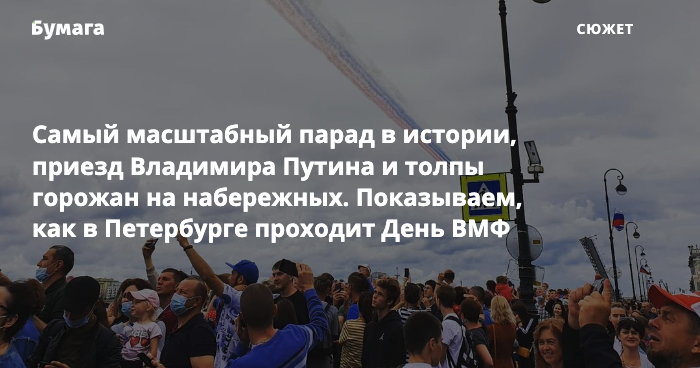 В Петербурге отметили День ВМФ. В центре города и в Кронштадте прошел парад с участием флота и авиации. Глава Минобороны Сергей Шойгу назвал этот парад «самым масштабным в новейшей истории», а на праздник прибыл президент Владимир Путин. В центре Петербурга были масштабные перекрытия, на которые жалуются горожане, а на набережных собрались сотни зрителей, несмотря на запрет Роспотребнадзора.