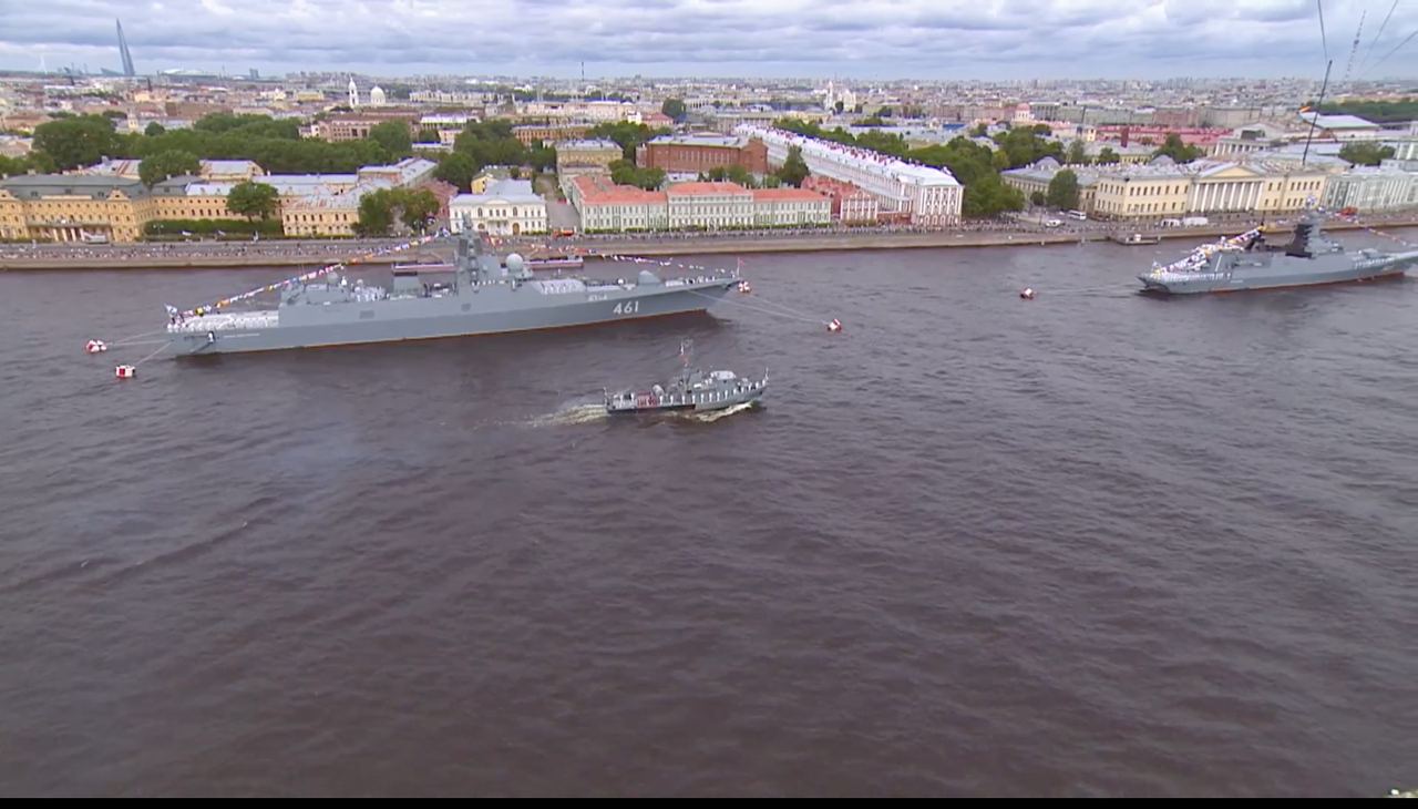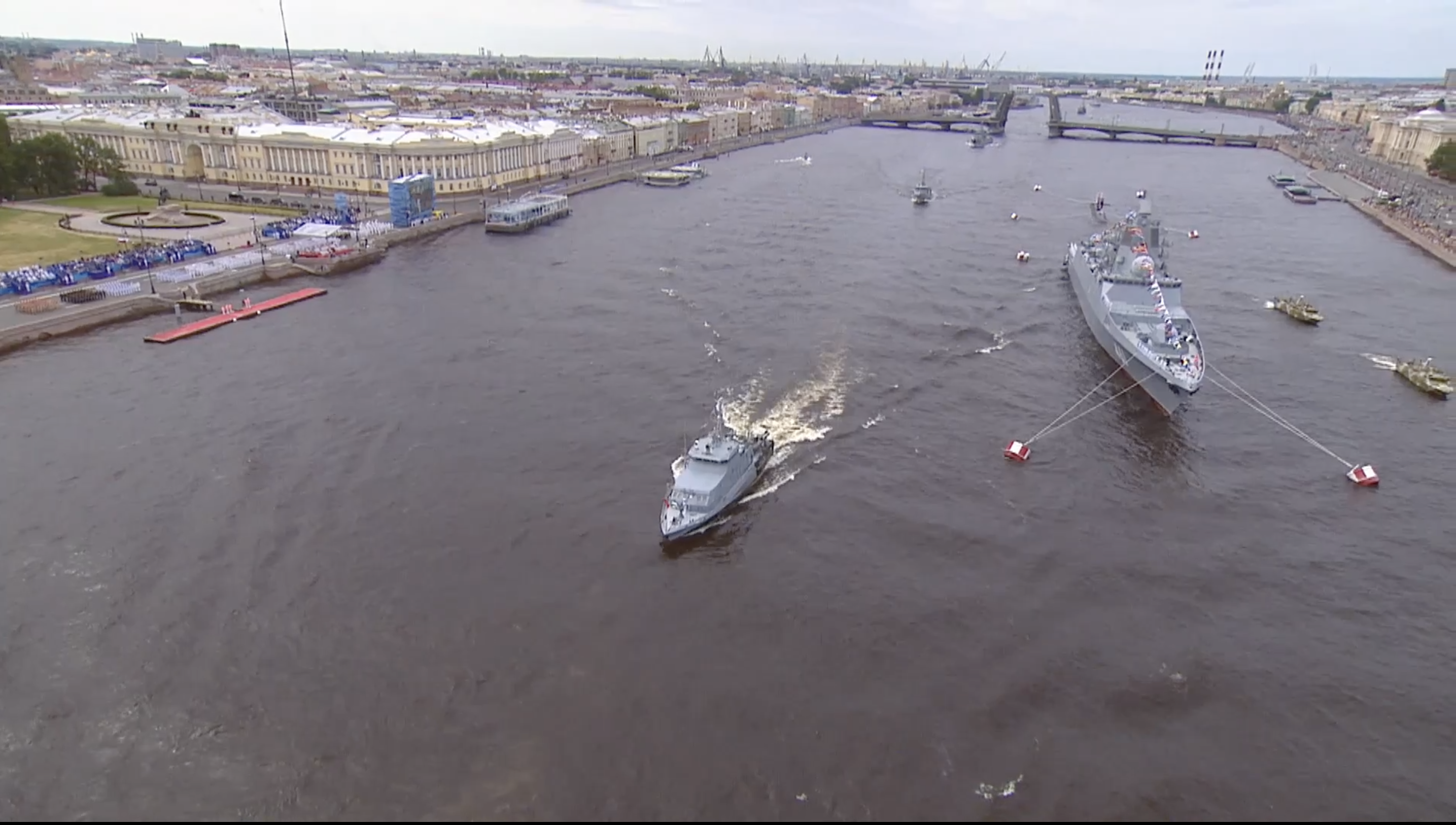 Парад в Петербурге начался в 11:00 с речи Путина о значении праздника для страны. После того, как президентский катер пришвартовался к Адмиралтейской набережной, по Неве прошли военные корабли.