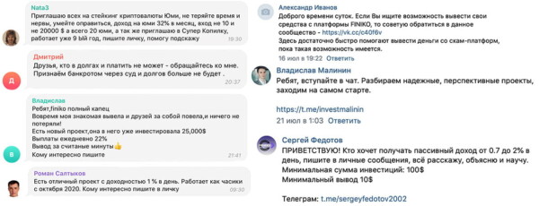 В чатах пострадавших массово стали появляться пользователи, которые привлекают в других финансовые пирамиды, чтобы «отбить потерянные деньги». Иногда встречаются юристы, которые обещают провести процедуру банкротства или подать в суд на Finiko — но, скорее всего, за ними тоже скрываются мошенники.