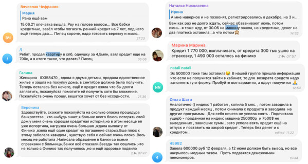 В чатах пострадавших от действий Finiko участники делятся своими историями — многие вложили крупные суммы, чтобы помочь родственникам или купить новое жильё. Некоторые брали кредиты на взнос в Finiko — и остались не только без денег, но и с долгами.
