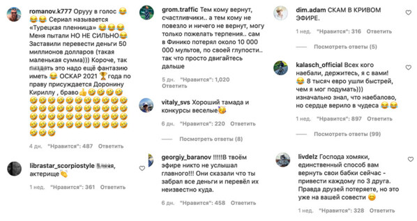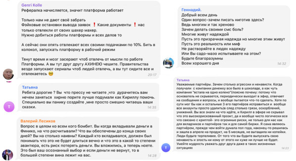 В то же время большинство комментаторов и участников чатов жалуются на то, что не могут вывести деньги — и уже вряд ли смогут. Доронина обвиняют в мошенничестве и называют «актёром» за трансляции в инстаграме, где он пытается оправдаться и переносит сроки выплат.