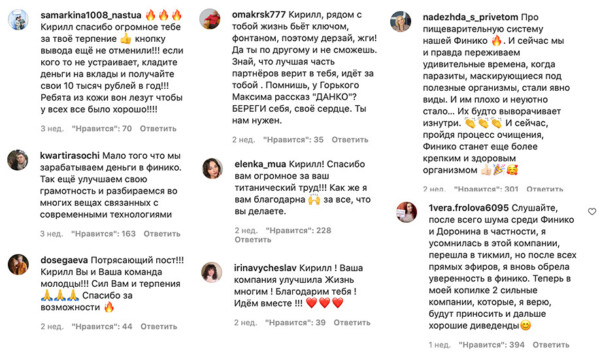 В инстаграме Доронина продолжали благодарить даже после «ссор с основателями» и перевода всех платежей на FNK — судя по комментариям, вкладчики верили, что рано или поздно смогут заработать.