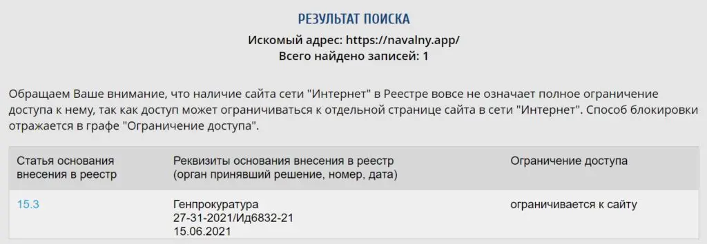 В реестре заблокированных ресурсов сказано, что зеркало было заблокировано по решению Генпрокуратуры от 15 июня, по которому накануне был заблокирован сам сайт Навального.