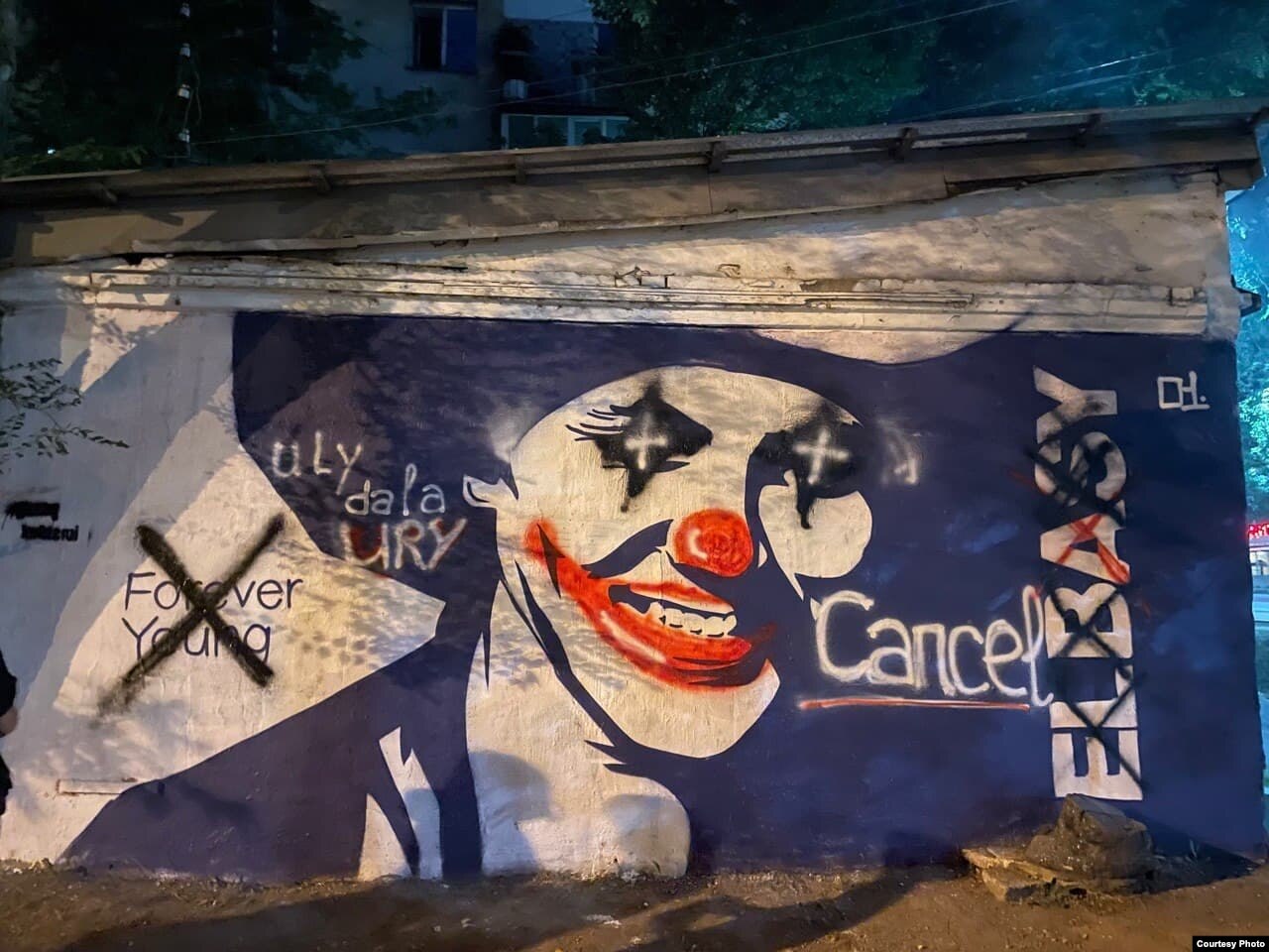 Слева на граффити была видна надпись ‘Uly Dala Ury’, что в переводе с казахского значит “вор великой степи”. Так активисты обыграли созвучную фразу “сын великой степи” — ‘Uly Dala Uly’. В тот же день мурал закрасили.
