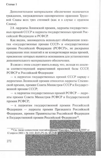 Но вот неувязочка! В 2005 году под редакцией А. Н. Пудова был издан Практический комментарий к федеральным законам под копирайтом Пенсионного фонда РФ, в котором на странице 272 (см. илл.) подтверждается использование законодателем обобщающего понятия «государственные премии», а исходя из анализа нормативно-правовой базы СССР, РСФСР и РФ подтверждается, что «к лауреатам государственных премий СССР, наряду с лауреатами Ленинской премии, относятся лауреаты Сталинской премии, премии Совета Министров СССР и Государственной премии СССР», а к «лауреатам государственной премии Российской Федерации — лауреаты премии Президента Российской Федерации, премии Правительства Российской Федерации и Государственной премии Российской Федерации».