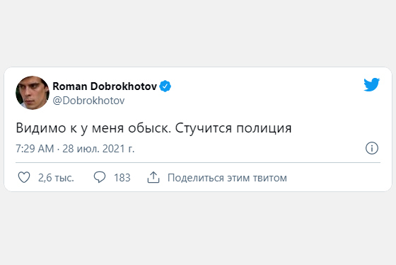 Об этом журналист написал в твиттере в 7:29 мск. Его жена обратилась за помощью в «ОВД-Инфо». Вскоре обыск начался у родителей Романа Доброхотова, передает телеграм-канал Baza.