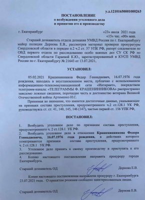 Дело связано с публикацией в телеграм-канале «Телеграммы Ф. Крашенинникова» от 5 февраля 2020 года: автор якобы намеренно распространял ложные сведения о 93-летнем ветеране Игнате Артеменко. Ветеран ранее был потерпевшим по делу о клевете, которое возбудили в отношении Алексея Навального.