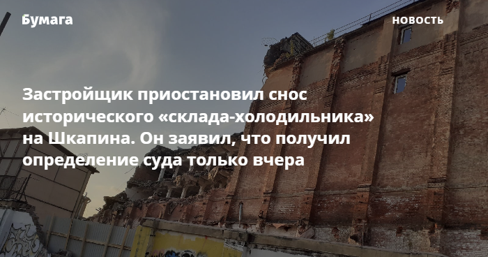 Застройщик приостановил снос исторического «склада-холодильника» на Шкапина. Он заявил, что получил определение суда только вчера