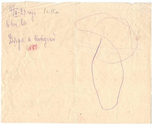 © ФГБНУ «ИХОиК РАО» Слева: Пригласительный билет на открытие выставки произведений В.Н. Чекрыгина 27 мая 1923 года. Оборот рисунка Нины ЧекрыгинойСправа: Рисунок Нины Чекрыгиной. 11 марта (?) 1924 года. Международная коллекция детского рисунка ФГБНУ «ИХОиК РАО». П. 275 № 599 Разумеется, пятно красной акварели на оборотной стороне печатного бланка назвать рисунком можно лишь условно. Но Вера Викторовна Чекрыгина была очень внимательна к этим первым шагам дочери. Она не только указывает возраст ребенка, но и записывает, что, по ее мнению, пыталась нарисовать маленькая Нина; ставит не только дату, но иногда и конкретное время суток. Так лист с несколькими линиями, проведенными детской рукой, становится свидетельством горя, тревоги за будущее ребенка и, конечно, большой любви.