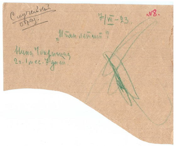 © ФГБНУ «ИХОиК РАО» Папка № 275 с наклейкой и надписью «Кабинет по изучению примитивного искусства под руководством профессора Бакушинского. Государственная академия художественных наук. 1919–1929 годы» Рисунки, представленные на выставке, демонстрируют основные направления, которыми занимались сотрудники физико-психологического отделения ГАХН и педагоги, участвовавшие в эксперименте (в частности, использовавшие в своей работе тесты Кабинета по изучению примитивного искусства и детского творчества). Это рисунки детей разных национальностей; рисунки одаренных детей; рисунки детей так называемого периода первого детства (от рождения до 6–7 лет), по терминологии А.В. Бакушинского [2]. К последним относятся и рисунки Нины Чекрыгиной, выполненные ею в возрасте 2–3 лет. Рисунки экспонируются впервые, о них никогда не писали. Удивительное совпадение — впервые рисунки Нины Чекрыгиной продемонстрировали публике в дни, когда в подмосковном Пушкине было торжественно открыто место памяти ее отца, художника Василия Чекрыгина.