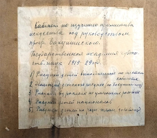 За несколько лет существования комиссии, позже переименованной в Кабинет по изучению примитивного искусства и детского творчества, сотрудники ГАХН проделали огромную работу. По свидетельству искусствоведа и педагога Н.П. Сакулиной, уже в 1927 году «комиссия располагала коллекцией в 20 000 экз., а также коллекцией вещей детского художественно-производственного творчества (народная игрушка, пряник и пр.)» [1]. После ликвидации Государственной академии художественных наук коллекцию передали в Центральный дом художественного воспитания детей Наркомпроса РСФСР (ЦДХВД). В 1940-е годы ЦДХВД был преобразован в Научно-исследовательский институт художественного воспитания Академии педагогических наук. Сегодня это Институт художественного образования и культурологии Российской академии образования, который и является организатором (совместно с ВМДПНИ) выставки «Дети авангарда».
