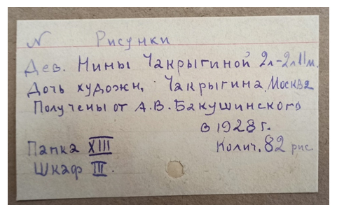 [8] В ФГБНУ «ИХОиК РАО» хранятся пять рисунков Нины Чекрыгиной, выполненных на обороте пригласительных билетов на открытие выставки произведений В.Н. Чекрыгина 1923 года.