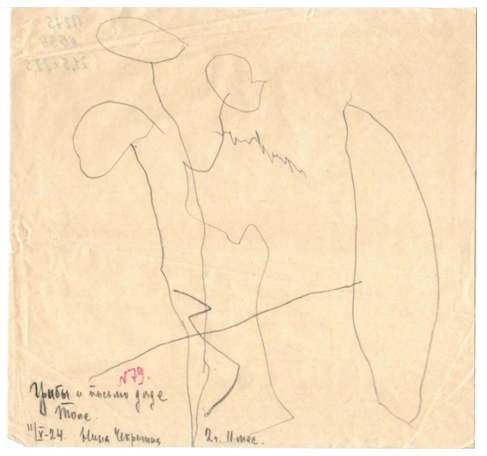 © ФГБНУ «ИХОиК РАО» Грибы и письмо дяде Толе. Рисунок Нины Чекрыгиной. 11 мая 1924 года. 2 года 11 месяцев. Международная коллекция детского рисунка ФГБНУ «ИХОиК РАО». П. 275 № 634 Осмелюсь предположить, что «дядя Толя» — это Анатолий Васильевич Бакушинский, благодаря которому и эти «грибы», и «попугай», и еще более 80 рисунков Нины Чекрыгиной оказались в коллекции Кабинета по изучению примитивного искусства и детского творчества. До нашего времени дошло 56 рисунков. Время их создания — 1923–1924 годы.