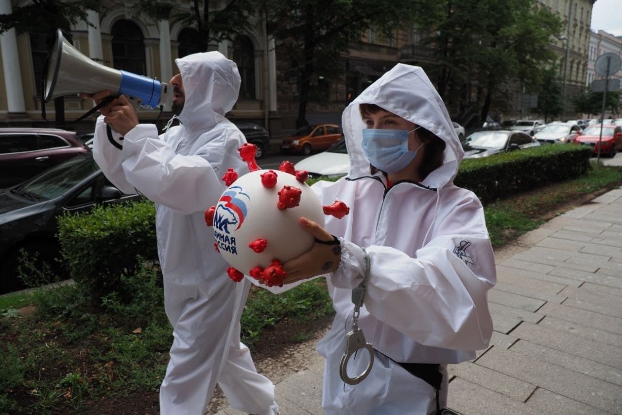 Акция проходила возле здания Минюста в Петербурге. Трое активистов, одетые в медицинские остюмы и маски, зачитали свой манифест и разбили макет коронавируса с логотипом «Единой России». Нацболы также попытались зайти внутрь ведомства, но их не пустили, поэтому они приковали себя наручниками к оконным решеткам Минюста.