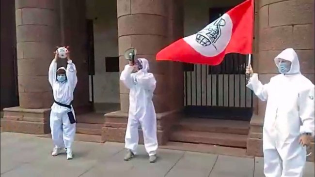 Трое активистов надели медицинские защитные костюмы, зачитали манифест и разбили макет коронавирусной частицы с символикой партии «Единая Россия». Затем нацболы попытались зайти внутрь Минюста, а когда им это не удалось, приковали себя к зданию.