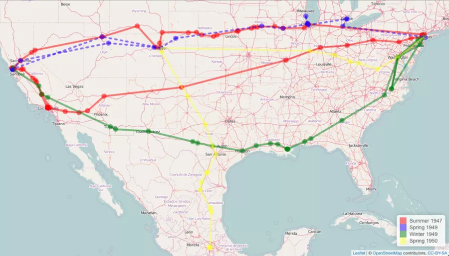 Этому соответствуют и те карты, которые рисовал в рабочих блокнотах сам Керуак, фиксируя собственные путешествия и составляя план романа. В своём рассказе Сал подробно фиксирует множество городков на трассе и расстояния между ними, сколько он уже проехал и сколько ему ещё осталось проехать.