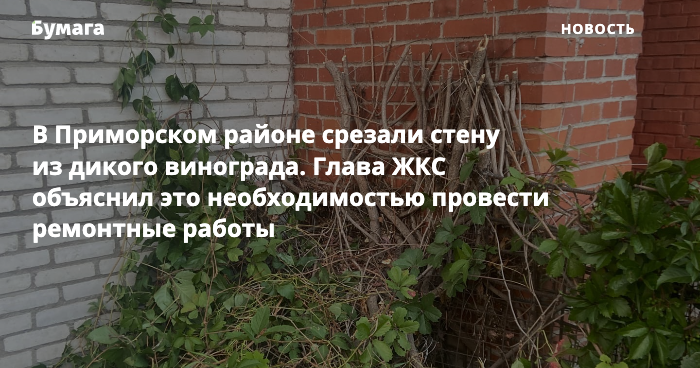 В Приморском районе сотрудники ЖКС № 1310 частично обрезали стену из винограда, которая росла более 20 лет по адресу: Долгоозерная, 1. Местные жители планируют восстановить растение. Об этом сообщает очевидец в сообществе «Приморский Онлайн | Новости нашего района | СПб».