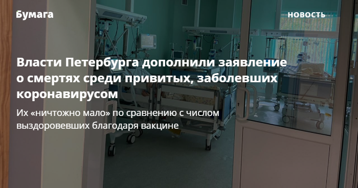 «Бумага» рассказывала, что известно о смертях петербуржцев, привитых от коронавируса. У них были другие тяжелые заболевания, но заявление властей всё равно вызвало ажиотаж у противников вакцин. Еще несколько месяцев назад городские власти отрицали факты смертей после полного курса вакцинации, где основной причиной стал коронавирус.
