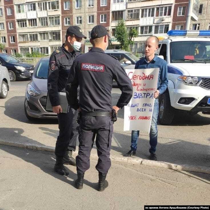 В Барнауле активист Антон Арцибашев вышел на пикет против снятия избиркомом с выборов в Госдуму РФ экс-кандидата в предиденты Павла Грудинина и депутата Николая Бондаренко. К пикетчику подошли полицейские и сотрудники администрации Барнаула, сообщил редакции Сибирь.Реалии Арцибашев.