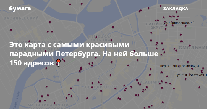 Авторы телеграм-канала «Парадные Санкт-Петербурга» нанесли на интерактивную карту десятки самых красивых парадных города. Там есть адреса Центрального, Адмиралтейского, Василеостровского и Петроградского районов Петербурга.